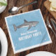 Este design bonito apresenta uma simples decoração de festas de animais azuis, um oceano de água de festas de piscina, com peixe-maria de cor aquática, um guardanapo de papel personalizado azul, uma bebida de bebida de cocktail, com vida marinha selvagem náutica, com tubarões cinzas marinhas pretas, um divertido piquenique festivo, excelente para a festa de natação de natação no verão, para a festa de aniversário de criança de verão no quintal