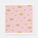 This napkin features a soft pastel pink background decorated with a whimsical pattern of gold glitter-style crowns and rosy pink hearts. The crowns vary slightly in size and are evenly spaced throughout the design, while the hearts and tiny pink dots add a playful, delicate accent. The overall pattern is seamless, balanced, and feminine—perfect for princess-themed celebrations, baby showers, or first birthday parties.