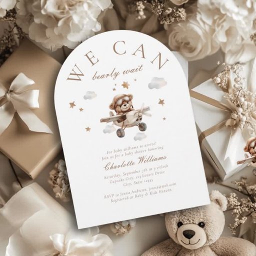 Podemos Esperar! Napentes de chá de fraldas bonitos e modernos com um Urso giro voando num avião, ilustração aquática e letra de escrita manual. Em apenas alguns cliques, personalize-o com seus próprios detalhes e preferências. Disponível em cores diferentes, para raparigas, rapazes e neutros em termos de gênero.