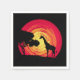 Ilustração do pôr do sol africano com sol vermelho, girafa e decoração da silhueta de árvore em fundo preto. É possível mudar a cor de fundo e adicionar uma diferente à design com sua escolha.