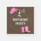 Com "Festa de aniversário" ou a opção de adicionar texto personalizado, esses guardanapos continuam o tema rodeio, castanho, rosa e impressão de vaca dos convites de primeiro aniversário/selar.