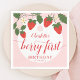 Um bonitinho guardanapo de primeiro aniversario de morango. Design apresenta morangos vermelhos, vinhas verdes e flores brancas sobre fundo de rosa claro com letra de escrita caligráfica.