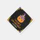 Abóbora de laranja adorável com um chifre de unicórnio dourado e um chapéu de bruxa roxa. O fundo preto tem o confete laranja, amarelo, verde e roxo do Halloween e flores florais e folhas nos cantos. Gráficos por PrettyGrafik