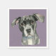 Esta é uma pintura da cabeça de um cão-touro preto. Ela tem a cabeça inclinada levemente e olhando para cima. Ela tem olhos castanhos. Isto foi pintado em aquarela.