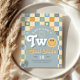 This groovy boys 2nd birthday napkin design captures 70s vibes with a blue pastel chequered border, and includes space for a name. Perfect for a cute "Two cool dude" boho birthday, this playful blue smile design adds charm to your little one's special day!