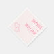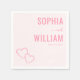 This wedding napkin design features a minimalist layout with a soft pink background, creating an elegant and romantic atmosphere. The names are displayed in bold, uppercase typography, while the conjunction is written in a delicate cursive script, enhancing the sophisticated feel. Two outlined hearts add a subtle decorative touch to the bottom left corner, complementing the tender mood of the design. Perfect for an intimate celebration, this napkin combines modern style with classic charm, making it ideal for weddings or special occasions.