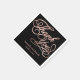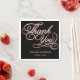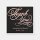 Um guardanapo de casamento com fundo preto com as palavras "Obrigado" em folha de ouro falso rosa e espaço para os nomes e a data de casamento da noiva e do noivo.