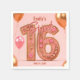 This paper napkin is a vision of elegance for a Sweet 16 celebration. It showcases a striking 3D-effect "Sweet 16" in luxurious rose gold, embellished with dazzling pink gemstones and intricate golden accents. The design is set against a soft blush pink background, completed with delicate floating rose gold balloons. The text is fully customizable, allowing for complete personalization of this stunning and memorable party detail.