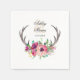 Uma escolha encantadora para recepções de casamento, festas de noivado ou chás de panela, este design de guardanapo de papel apresenta chifres de veados belamente embelezados com aquarelas em matizes roxas, magenta e rosa.