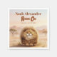 Safari theme first birthday party napkins featuring an original character from the Hystrix Little Thoughts® collection. This design features Zuberi: a charming fluffy leopard character, whose name means “strong” and “powerful,” adding a meaningful and symbolic touch to this “Roaring One” birthday. Set in a soft watercolor African safari landscape with warm earth tones, gentle hills, and acacia trees, this invitation creates a sweet and adventurous atmosphere, perfect for a wild one safari party or baby boy first birthday.