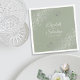 Estes bonitos guardanapos farão da sua recepção de casamento algo especial. Eles apresentam um design simples, mas elegante, com texto de Cinza pálido em um fundo verde sábio com caramujos de folha fina prateada e espirros nos cantos. Personalize facilmente com seus nomes e a data do casamento.