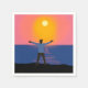 Saudação ao Sol. Um homem está parado numa praia virada para o mar aberto e saudando o sol amarelo com braços levantados.