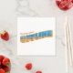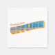 Um design retrô apresenta as palavras "Saudações do Offline" com uma cena de praia e oceano incorporada às letras.