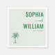 This wedding napkin design features a minimalist layout with a light green background, creating a serene and sophisticated atmosphere. The composition includes bold, uppercase serif typography for the names, paired with a delicate script-style "and," while a simple sans-serif font presents the date. A single palm tree illustration adds a tropical touch to the understated aesthetic. The overall style is modern and elegant, perfect for a formal yet relaxed celebration.