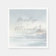 This wedding napkin design features a serene coastal scene with soft pastel colors, including light blues, grays, and hints of pink and white. The watercolor style creates a dreamy, ethereal quality, showcasing gentle waves crashing against rocky shores and a prominent red and white striped lighthouse. Elegant cursive typography is centrally positioned above the lighthouse, while customizable placeholder text allows for personalization. The overall mood is calm and romantic, perfect for adding a touch of tranquility to your special day.