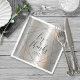 Mostre amor e obrigados aos seus convidados de casamento com este elegante design de guardanapo de papel. As peças nesta suite de casamento moderna apresentam elegantes sotaques manuscritos e um elegante fundo metálico de prata sobreposto com um delicado padrão geométrico em preto básico. As iniciais da noiva e do noivo e a data do casamento podem ser personalizadas usando o modelo fornecido. Procure ID648 para ver todas as peças neste conjunto elegante.