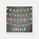 Bandeiras divertidas e coloridas com nomes de guardanapos de festa de aniversário para crianças. Design de aniversário bonito para crianças com bandeiras de festa em cores verdes, vermelhas e azuis em um fundo de cinza de tendências, e um nome - personalize os guardanapos com o nome de seu filho e faça seu próprio decoro de festa divertida. Seu filho ou garota e os hóspedes adorarão esses bonitinhos guardanapos.