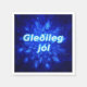 Um enxame de flocos de neve fractais azuis. O texto islandês que lê "Gleðileg jól" (Feliz Natal) aparece em azul e branco brilhantes.