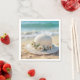 Um chapéu de verão feminino adorado com margaridas repousa na praia arenosa, com leves ondas oceânicas ao fundo