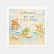 A cheerful surf-inspired baby shower design featuring sunny skies, rolling ocean waves, seashells, and playful beach elements. This light, summery artwork is ideal for a relaxed seaside celebration and can be easily personalized with names, dates, and event details while keeping a fresh coastal vibe.