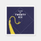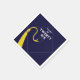 Guardanapos de festa de formatura criativos para a turma de 26 formandos com linha engraçada e clássico boné de formatura com borla dourada em fundo azul marinho.