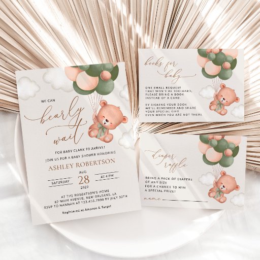 Adicione um toque pessoal à celebração do seu chá de fraldas com estes itens de na moda e festa memoráveis! Design apresenta um urso bebê com balões verdes sobre fundo bege.