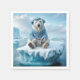 Um urso polar vestindo uma camisola azul, pulgas e um chapéu sentado em um icebergue enquanto segurava um jornal chamado "Notícias Polares".