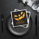 O vamos fica assustado com o rosto assustador de Jack-o-lanterno em guardanapos de papel preto.