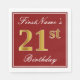 Este simples e elegante design de guardanapo de papel apresenta uma mensagem como "aniversário de 21 anos do Primeiro Nome" (com as "21ruas" a apresentarem uma coloração falsa em ouro) dentro de uma área quadrada de cor vermelha com um contorno de fronteira simples. O nome está em um texto semelhante a script de cor branca e pode ser personalizado. Napkins como estes poderia talvez ser usado numa festa de aniversário para alguém que comemora seu vigésimo primeiro aniversário. [~Z0000138]