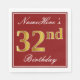 Este simples e elegante design de guardanapo de papel apresenta uma mensagem como "NameHere's 32nd Birthday" (com o "32º" a ter uma coloração falsa em ouro) dentro de uma área quadrada de cor vermelha com um contorno de fronteira simples. O nome está em um texto semelhante a script de cor branca e pode ser personalizado. Napkins como estes poderia talvez ser usado numa festa de aniversário para alguém que comemora seus trinta e dois anos. [~Z0000138]