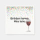 Vidro de vinho tinto com confete de festa de aniversário e citação divertida sobre fundo branco. A cotação pode ser editada. A cor de fundo pode ser alterada.