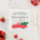 Vintage Rustic Personalised Paper Napkins apresenta um caminhão de coleta vermelho vintage com uma árvore de Natal no fundo. Lenha rustica de madeira, personalize com sua família ou nome comercial. Parte de uma coleção.