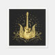 Violão de ouro estilo fantasia com asas, detalhes de rolagem e notas musicais.