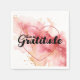 O guardanapo de Gratidão com as palavras em preto contra um padrão de tinta rosa e bronzeada e o esboço de um coração de amor cor-de-rosa que acabou de ficar por trás do texto.