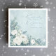 White Roses Hellebores Silver Eucalyptus floral wedding napkin featuring elegant calligraphy script modern watercolor flowers frosty pale blue background and snowflake details