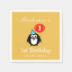 Guardanapos personalizados de primeiros aniversarios com pinguim bonitinho segurando um balão vermelho. Design de desenho animado e engraçado com data de nascimento ou celebração e número de idade. Um desenho animado de crianças com olhos grandes e chapéu de festa. Crie seus próprios guardanapos de papel de rico com texto personalizável. Nas rosas claro pastel, cinzas púrpuras de cor azul, etc. Adequado para meninos e meninas. Impressão neutro. Ótima ideia para a nova mãe, para a mãe ser, para tomar banho de bebês etc. Também é divertido para a festa do chá de fraldas infantil. Modelo de tipografia de na moda elegante.