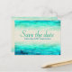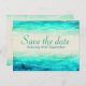 Salve a data dos espumantes de casamento pintados em um efeito azul e verde de turquesa azul-turquesa com uma onda gráfica sobre fundo arenoso. O casamento original salvou o cartão postal. Perfeito para um casamento de praia, costeira ou de destino tropical. Parte do jogo de casamento espumante. Uma elegante design exclusiva de Sarah Trett.