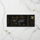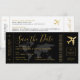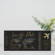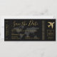 Cartão de Embarque Passagem Aérea Salve o Dia Convite em preto e dourado chique e elegante para um Casamento de Destino moderno apresentando um logotipo de avião romântico e mapa-múndi ao fundo e espaço no verso para informações de viagem e hospedagem para os convidados começarem a planejar sua viagem para celebrar seu casamento no meio de umas férias.