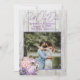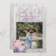 Madeira russa, guarde os anúncios de fotos com lavanda floral. O texto roxo escuro é fácil de personalizar em dois lugares. Adicione uma foto do casal em um modelo quadrado junto ao roxo. Um buquê floral em pêssego e lavanda decora o canto inferior. O fundo é painéis brancos de madeira. Escolha a opção impressa ou descarregável.