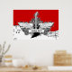 Guitarra branca preta, com asas poster impressão, apresentando uma guitarra elétrica, asas, chamas e espirais em pentagrama de música, anotações e clave tripla sobre fundo vermelho. Um presente de excelente para um músico, guitarrista ou amante.