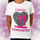 Rainha da Ginástica e Corações! Diz a "ginástica" em uma fonte de dois tons, tem um grande coração profundo de brilho prateado com um ginasta no balanço fazendo uma habilidade de dar um passo na primavera traseira, personalizada com o nome de seu filho!