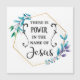 Há o Poder no Nome de Jesus, este design cristão apresenta uma coroa floral azul com texto cristão dizendo "Há o poder em nome de Jesus".