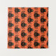 Esta tapeçaria maravilhosa apresenta uma aranha preta assustadora com oito pernas peludas, olhos amarelos com grandes pupilas pretas e sua boca aberta mostrando suas presas. Há um texto laranja que diz "Feliz Dia das Bruxas" e um fundo laranja correspondente.