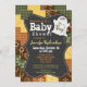 Convite de chá de fraldas de outono para chás de fraldas temáticos do Halloween em outubro ou outono. Uma manta de retalhos bonita parece fundo com padrões verdes, castanhos, amarelos e laranja gingham e paisley. Você pode mudar a redação do fantasma branco de desenho para ler É um menino ou é uma garota! As imagens utilizadas neste item são licenciadas e © Graphics Factory.com