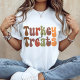 Halloween Retro vivia t-shirt com a frase "Turquia e Tratamentos". Uma maneira engraçada de mostrar que você é um Halloween e um entusiasta da Ação de Graças
