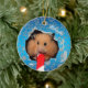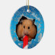 Um hamster come uma bengala de Natal depois de ter mastigado um buraco num ornamento azul.