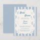 A hand drawn style Bridal Shower invitation with beach, coastal theme. A soft ivory and dusty blue striped colored background, with an ivory frame and dusty coastal blue elements. Personalize and add her name and the party details.