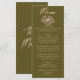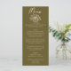 A colorful retro funky modern grasslands green and sweat cream floral wedding dinner menu. Which features chic template design of boho vintage green background on the front and back. With cream whimsical typography and hand drawn floral bouquet. Perfect and matching with the whole suite.