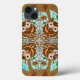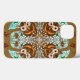 Coruja Desenhada Mão Trabalho de arte com galhos de árvores, folhas de outono e capas de telefone de acentos azuis e castanhos.