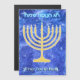Uma menorah Hanukkah de ouro brilhante e um texto hebraico lendo, "Chag Chanukkah Sameach" (Feliz Hanukkah) em azul e branco brilhantes é sobreposta a uma imagem fractal azul e branca que lembra flocos de neve em uma tempestade. Adicione seu próprio texto adicional.